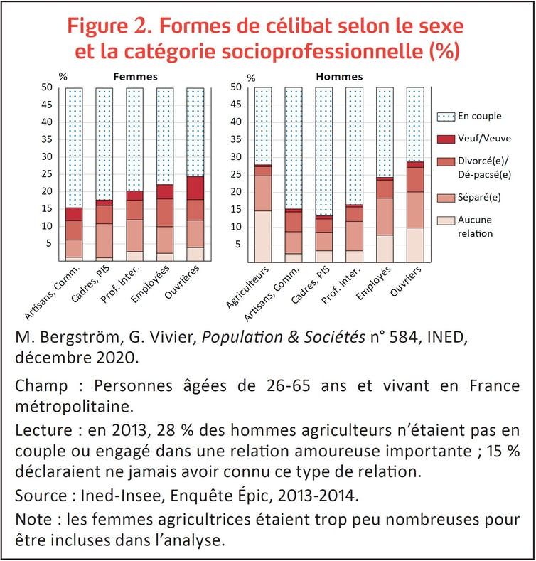 La moindre fréquence du célibat dans les classes supérieures semble coïncider avec une norme conjugale plus forte. Inversement, dans les classes populaires où la vie hors couple, la monoparentalité et le célibat définitif sont plus répandus, ces situations sont peut-être moins stigmatisées et excluantes. Ces différences de vécus et de perceptions de la vie célibataire sont particulièrement marquées chez les femmes.»