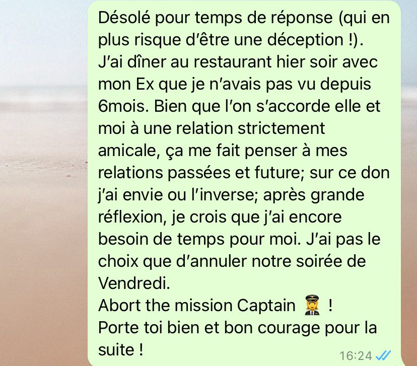 C’est exactement ça, mais elle dit pas qu’elle est back, c’est elle qui me demande si je suis back sur le dating scène parce que je lui avais fait quelques semaines au paravant « je pense trop à mon ex, je ne suis pas encore prêt » pour l’esquiver