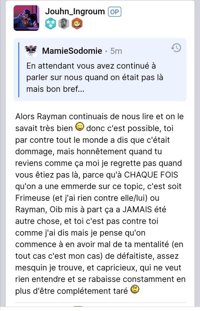 Gros j'ai à peine lu chaque fois qu'on a une emmerde c'est parce que tu te prend pour un gudard alors que t'es juste un phasme ou alors parce que votre pote oib fais chier