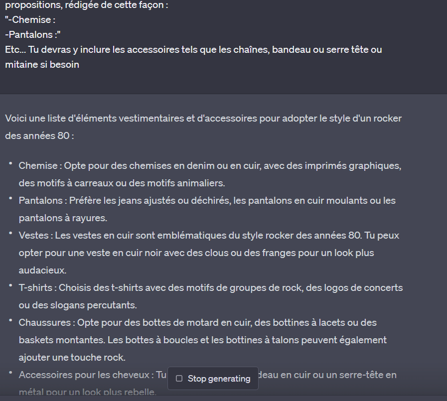 Je vais demander à chatGPT comment m'habiller comme un rocker des années 80 finito de vivre en 2023