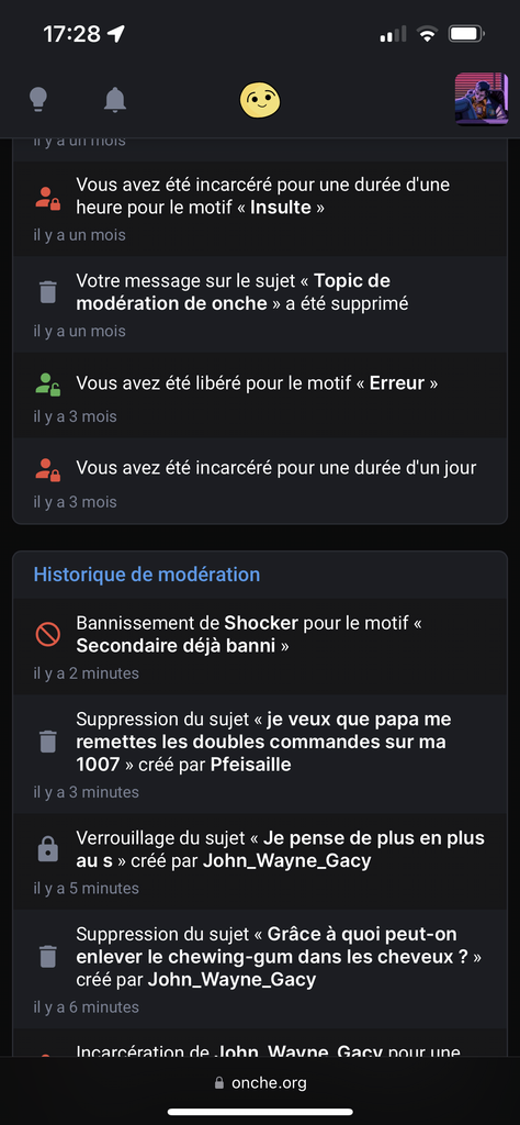 Surtout qu'il a été bàv aussi car il se foutais de la gueule de certains modos (ceux qui viennent d'avnoel) en leakant une photo d'une IRL, alors moi je les connais pas donc je sais pas s'ils se moquent des kheys d'avnoel et taille les modos à partir de là ou si c'était vraiment des modos, mais rien que ça pour moi je trouve ça limite quand on voit le motif de ban d'Oib par exemple