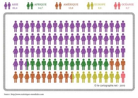 La répartition des différentes populations en 2009 selon les continents donc ça date... Il me semble que la proportion de la population du continent Africain a augmenté depuis...