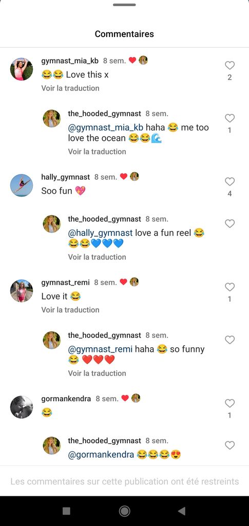 Je vais jeter un œil à un de ces comptes et, de la même manière, je constate le même type section commentaire : plein de pseudos contenant "gymnast" + un prénom + éventuellement un âge où une date de naissance (2014 pour vous donner un exemple