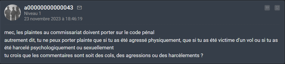 Ce compte s'est adressé à moi directement personnellement en me tutoyant sans ne dire bonjour en me conseillant de prendre les AD auxquels je demandais alors conseil sur le forum. La tournure du message laissait clairement penser que cette personne me connaissait, je n'ai pas reçu de réponses lorsque je lui ai fait part de ma remarque