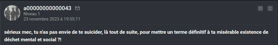 J'ai tellement été harcelé sur les forums jvc : football, boxe, FM... (FM où un modo raciste me bannissait à vue carrément). Boxe c'était le paroxysme (menaces de mort, faux profil, insultes, rabaissement etc...).