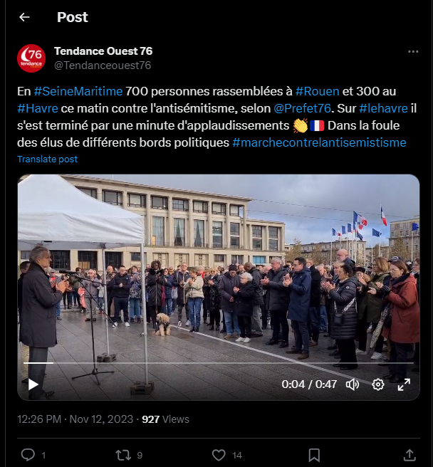 En #SeineMaritime 700 personnes rassemblées à #Rouen et 300 au #Havre ce matin contre l'antisémitisme, selon