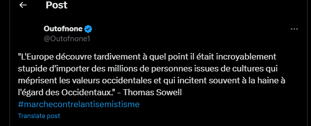 "L'Europe découvre tardivement à quel point il était incroyablement stupide d'importer des millions de personnes issues de cultures qui méprisent les valeurs occidentales et qui incitent souvent à la haine à l'égard des Occidentaux." - Thomas Sowell #marchecontrelantisemistisme