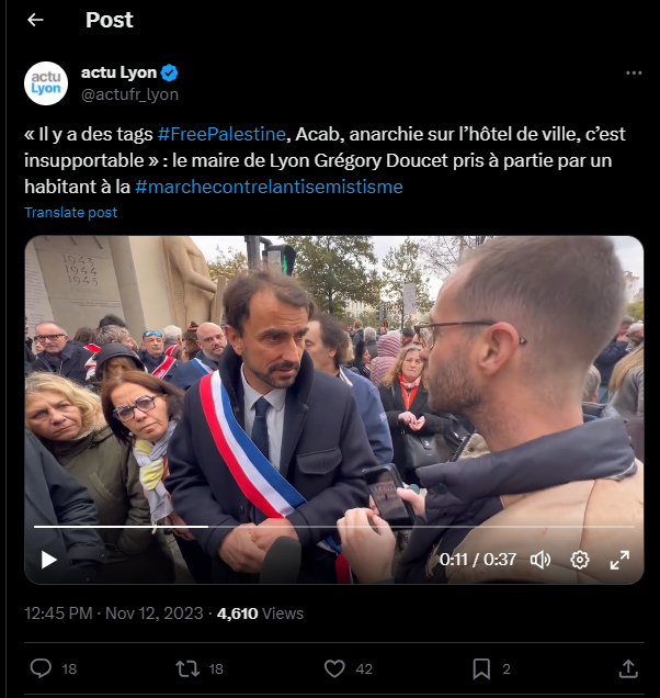« Il y a des tags #FreePalestine, Acab, anarchie sur l’hôtel de ville, c’est insupportable » : le maire de Lyon Grégory Doucet pris à partie par un habitant à la #marchecontrelantisemistisme