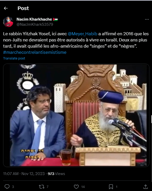 a affirmé en 2016 que les non-Juifs ne devraient pas être autorisés à vivre en Israël. Deux ans plus tard, il avait qualifié les afro-américains de “singes” et de “nègres”. #marchecontrelantisemistisme
