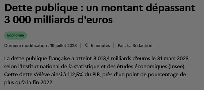La dette publique française a atteint 3 013,4 milliards d'euros le 31 mars 2023 selon l'Institut national de la statistique et des études économiques (Insee). Cette dette s'élève ainsi à 112,5% du PIB, près d'un point de pourcentage de plus qu'à la fin 2022.