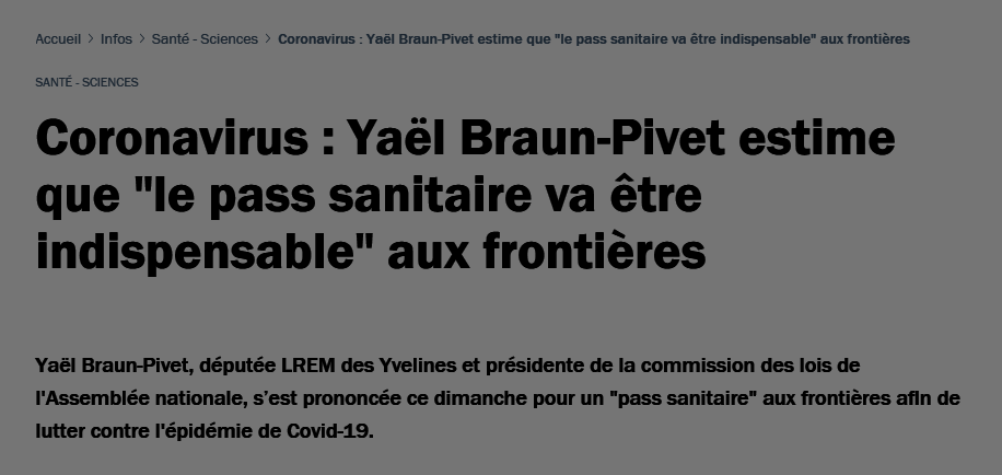 Yaël Braun-Pivet, députée LREM des Yvelines et présidente de la commission des lois de l'Assemblée nationale, s’est prononcée ce dimanche pour un "pass sanitaire" aux frontières afin de lutter contre l'épidémie de Covid-19.