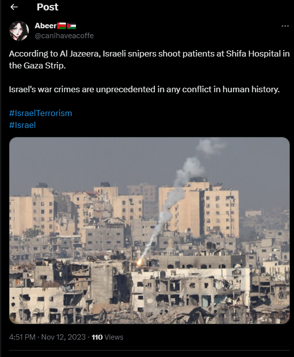 Selon Al Jazeera, des tireurs d'élite israéliens tirent sur des patients à l'hôpital Shifa, dans la bande de Gaza.