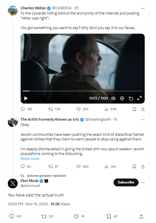 ils ne parlent pas non plus du fait que depuis que Musk a pris le contrôle de twittax, ils peuvent y dire ce qu'ils veulent ou presque, et que Musk ne s'en prive pas lui même d'ailleurs