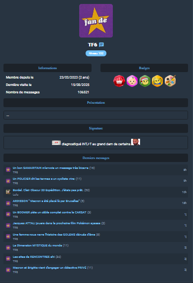 6 août 2025, présent depuis le 15 mars 2023, après presque 2 ans et demi de forum, 143037 messages, le forumeur @Jouhn_Ingroum quitte le forum.