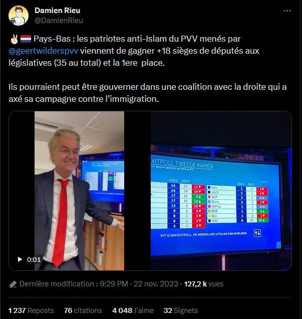 Par contre attention, le monsieur-de-l'extrême-droite-qui-va-redresser-le-pays a d'autres priorités : « En matière de politique étrangère, il défend une approche « les Pays-Bas d’abord », qui comprend la fermeture de sa représentation à Ramallah et le renforcement des liens avec Israël, notamment le déplacement de son ambassade à Jérusalem. »