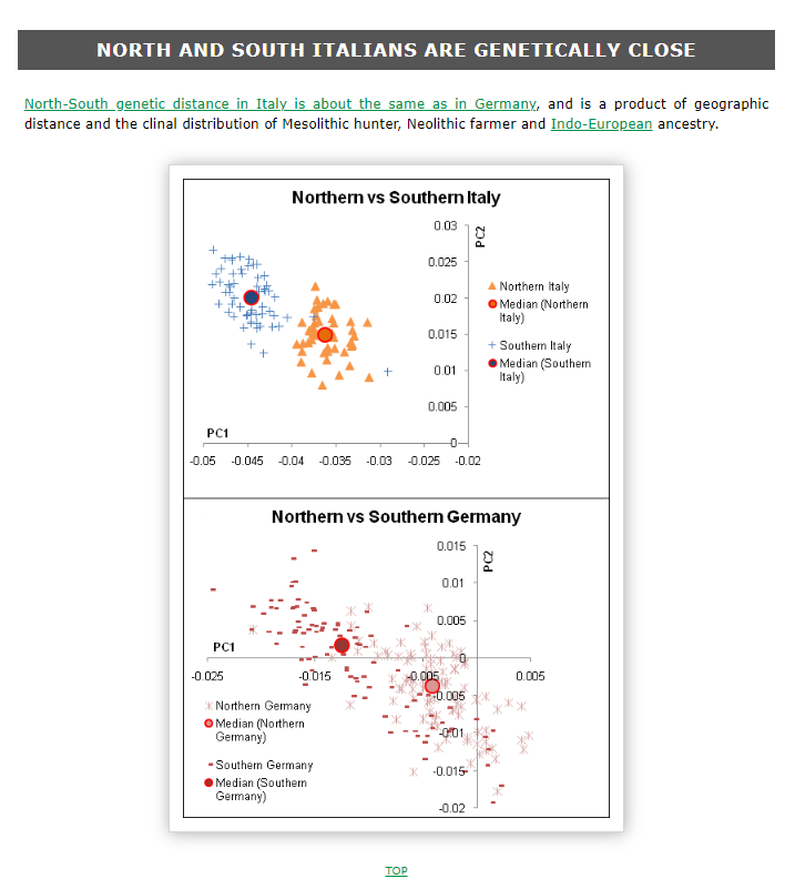De plus regarde la distance génétique entre les italiens du nord et du sud, elle est infime elle aussi, aussi infime que celle entre les germains du nord et du sud :