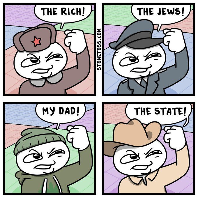 (le communiste en haut à gauche accuse les riches, le nazi les juifs, le fils son père, etc)