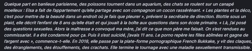 « J’ai été violée 240 fois, ce n’est pas de la torture ça ? Quatre-vingt-huit fois sur le Bukkake, quarante-quatre fois en une heure. Je sais que j’ai été violée, ce n’est pas ça le sujet, le sujet c’est la torture. Aucun humain n’est capable d’absorber quarante-quatre pénétrations en une heure. Ce qu’on nous a fait, c’est ce que les barbares faisaient aux femmes dans l’Antiquité, on n’a pas plus évolué que ça ? »