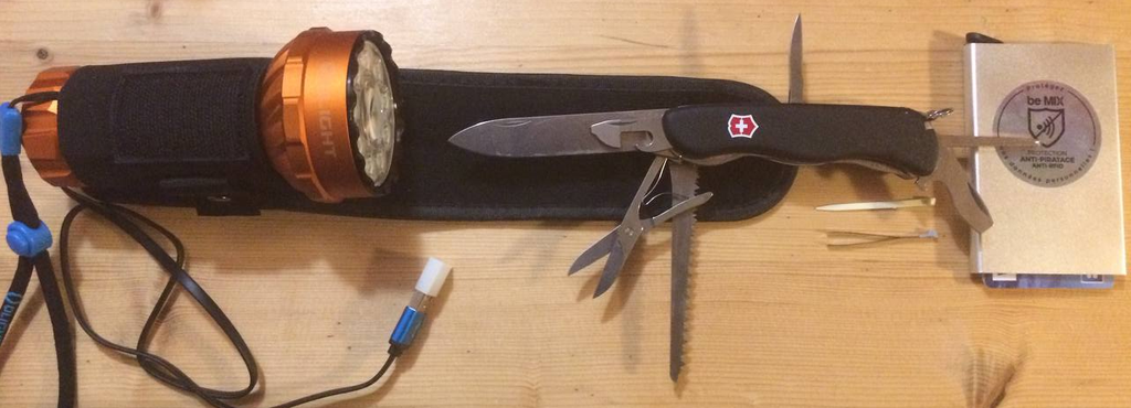 Donc moi pour ma part ça reste simpliste. Un couteau suisse, une lampe énervée pour les déplacements de nuit et un machin pour ranger les cartes bleu qui bien sûr peut-être stocké dans un portefeuille.