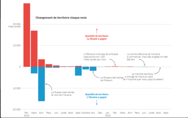 Moins de territoires ont changé de mains en août qu’au cours de tout autre mois de la guerre, selon une analyse du New York Times des données de l’Institute for the Study of War. Alors que l’Ukraine a réalisé de légers progrès dans le sud, la Russie a globalement conquis un peu plus de terres, principalement dans le nord-est.