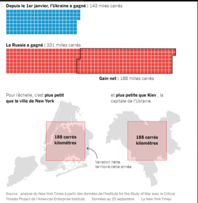 Si l’on additionne les gains des deux camps, la Russie contrôle désormais près de 200 milles carrés de territoire supplémentaire en Ukraine par rapport au début de l’année.
