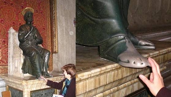 À l'instar des Musulmorts qui vénèrent la pierre de la Kaaba, les Catholiques vénèrent l'idole qu'ils ont attribuée à l'apôtre Pierre.