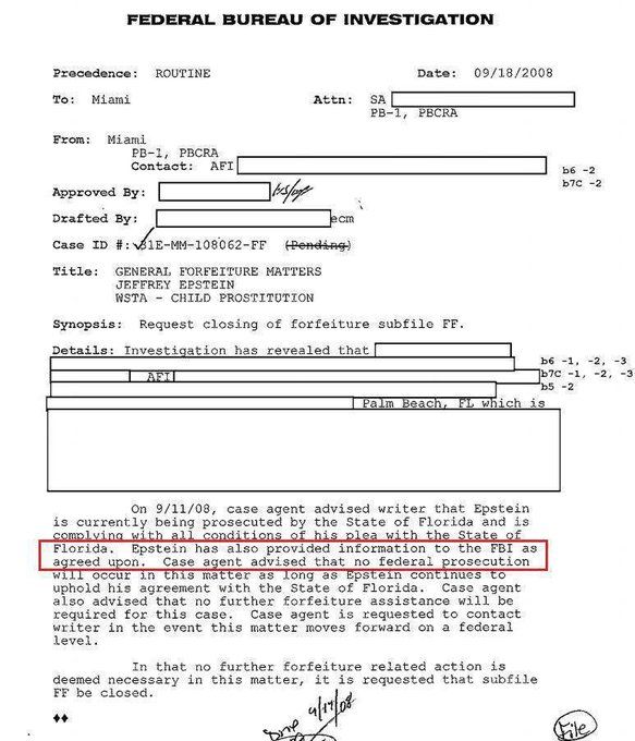 "Esptein has also provided information to the FBI as agreed upon. Case agent advised the no federal prosecution will occur in this matter as long as Epstein continues to uphold his agreement with the State of Florida."