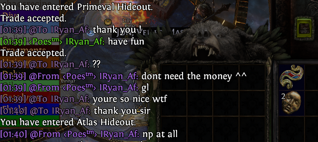 Si vous voulez de l'aide pour commencer sur la League je peux vous filer quelques items de levelling sympas ou quelques chaos pour bien commencer :zidane_poe: