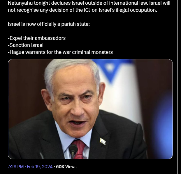 Netanyahu déclare ce soir qu’Israël est hors du droit international. Israël ne reconnaîtra aucune décision de la CIJ sur l’occupation illégale d’Israël.