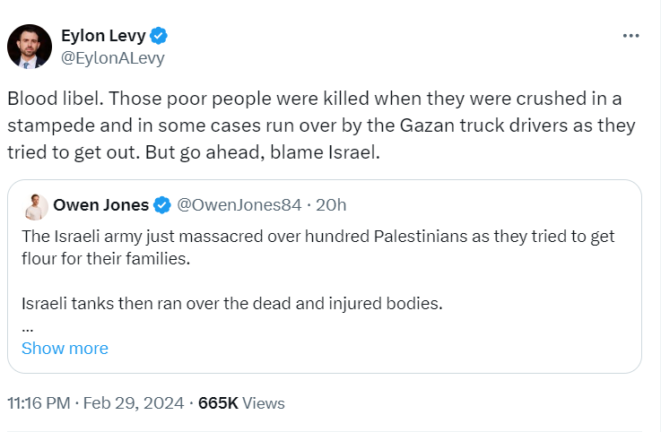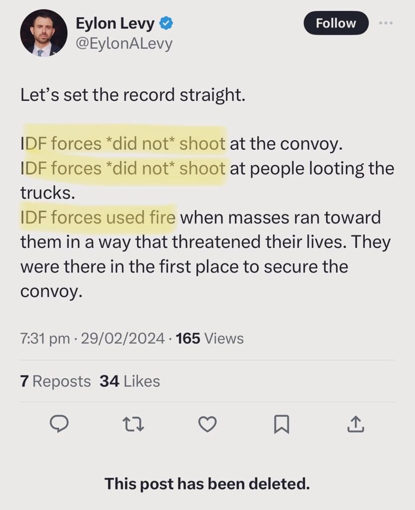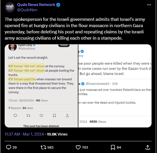 Le porte-parole du gouvernement israélien admet que l'armée israélienne a ouvert le feu sur des civils affamés lors du massacre dans le nord de Gaza hier, avant de supprimer son message et de répéter les affirmations de l'armée israélienne accusant les civils de s'entre-tuer dans une bousculade.
