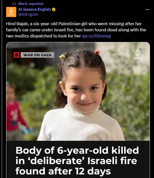 Hind Rajab, une petite Palestinienne de six ans disparue après que la voiture de sa famille ait été la cible de tirs israéliens, a été retrouvée morte avec les deux médecins envoyés pour la rechercher http://aje.io/88swwg