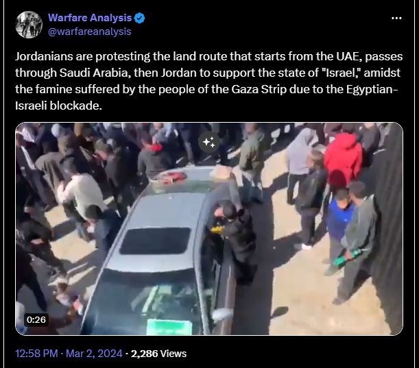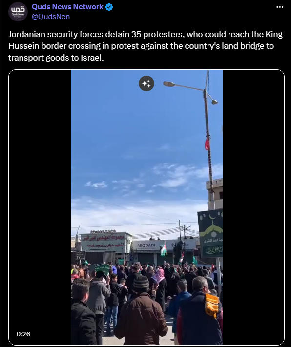 Les Jordaniens protestent contre la route terrestre qui part des Émirats arabes unis, passe par l'Arabie saoudite, puis la Jordanie pour soutenir l'État d'« Israël », au milieu de la famine dont souffre la population de la bande de Gaza à cause du blocus égypto-israélien.