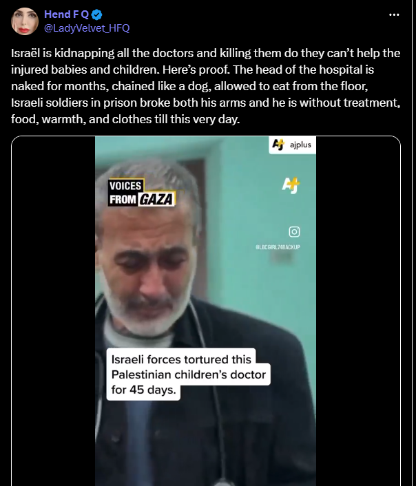 Israël kidnappe tous les médecins et les tue parce qu’ils ne peuvent pas aider les bébés et les enfants blessés. En voici la preuve. Le chef de l’hôpital est nu depuis des mois, enchaîné comme un chien, autorisé à manger par terre, les soldats israéliens en prison lui ont cassé les deux bras et il est jusqu’à ce jour sans soins, sans nourriture, sans chaleur et sans vêtements.