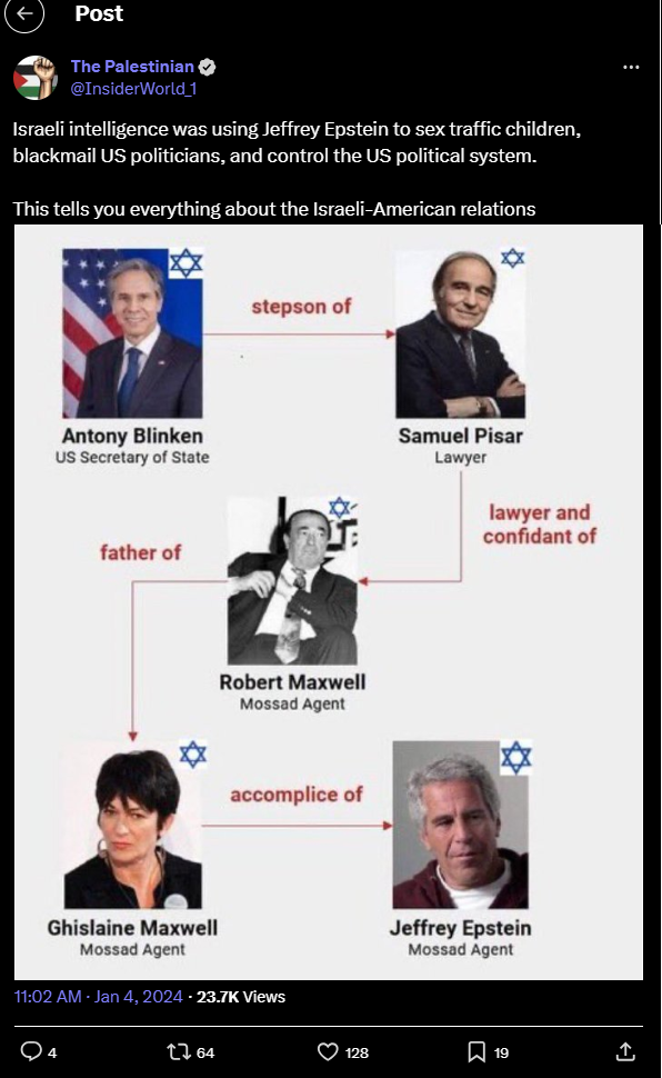 Les services de renseignement israéliens utilisaient Jeffrey Epstein pour trafiquer sexuellement des enfants, faire chanter les politiciens américains et contrôler le système politique américain.