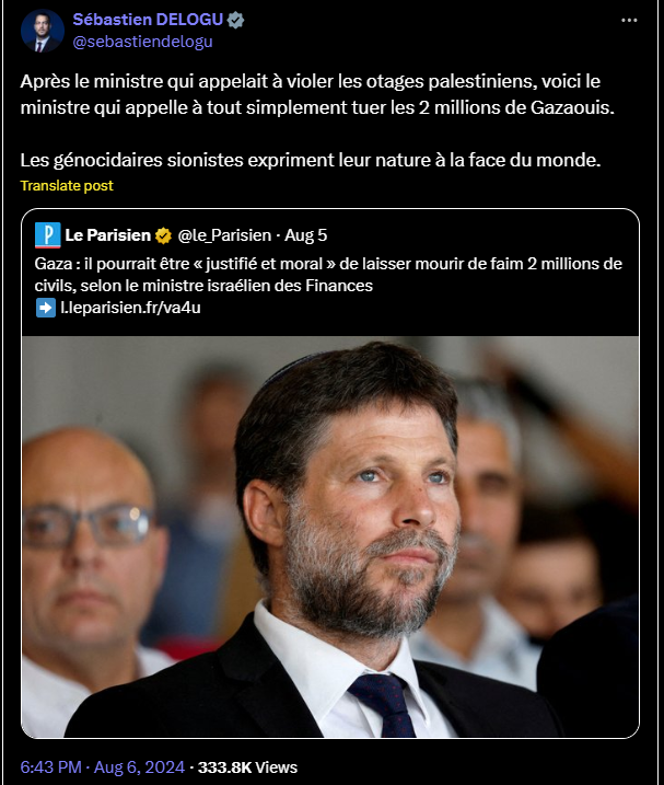 « Après cette énième déclaration, on a le droit de parler de génocide? », s’interroge le député NFP Aymeric Caron sur le réseau social X. « Et après on va nous dire que l’intention génocidaire n’existe pas ? », écrit le député LFI Thomas Portes sur X également.