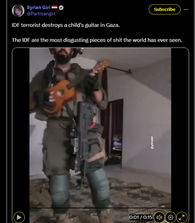 Un terroriste de Tsahal détruit la guitare d'un enfant à Gaza.
