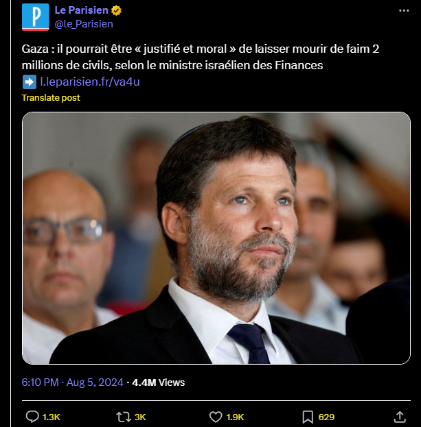 Gaza : il pourrait être « justifié et moral » de laisser mourir de faim 2 millions de civils, selon le ministre israélien des Finances