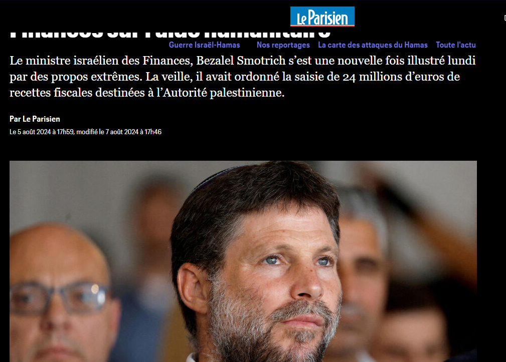 La veille, Bezalel Smotrich avait ordonné la saisie de 100 millions de shekels (24 millions d’euros) de recettes fiscales destinées à l’Autorité palestinienne, confrontée à de graves problèmes budgétaires. Il a affirmé que ces fonds seraient réalloués pour indemniser les victimes israéliennes du terrorisme.