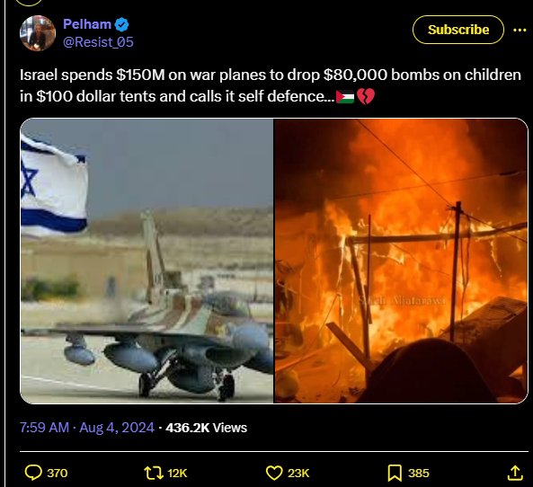 Israël dépense 150 millions de dollars en avions de guerre pour larguer des bombes à 80 000 dollars sur des enfants dans des tentes à 100 dollars et appelle cela de la légitime défense…