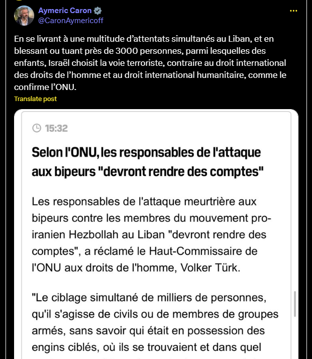 En se livrant à une multitude d’attentats simultanés au Liban, et en blessant ou tuant près de 3000 personnes, parmi lesquelles des enfants, Israël choisit la voie terroriste, contraire au droit international des droits de l’homme et au droit international humanitaire, comme le confirme l’ONU.