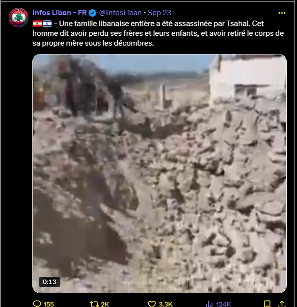 🇱🇧🇮🇱 - Une famille libanaise entière a été assassinée par Tsahal. Cet homme dit avoir perdu ses frères et leurs enfants, et avoir retiré le corps de sa propre mère sous les décombres.