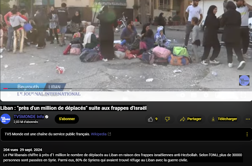 Le PM libanais chiffre à près d'1 million le nombre de déplacés au Liban en raison des frappes israéliennes anti-Hezbollah. Selon l'ONU, plus de 30000 personnes sont passées en Syrie. Parmi eux, 80% de Syriens qui avaient trouvé réfuge au Liban avec la guerre civile.