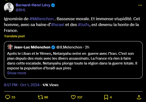 Ignominie de #Mélenchon. Bassesse morale. Et immense stupidité. Cet homme, avec sa haine d’#Israel et des #Juifs, est devenu la honte de la France.