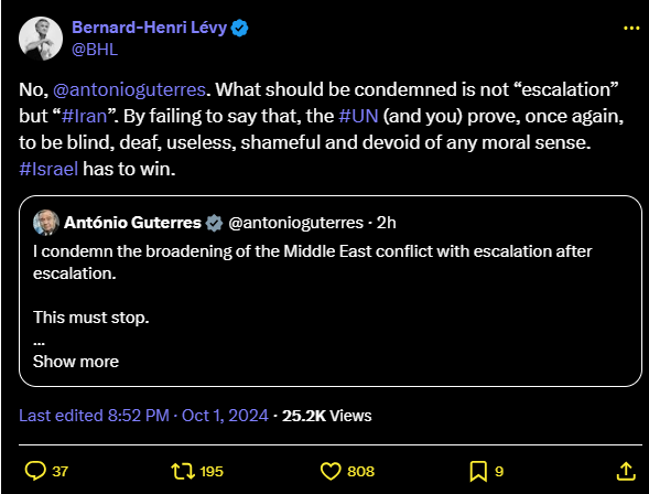 No, @antonioguterres. What should be condemned is not “escalation” but “#Iran”. By failing to say that, the #UN (and you) prove, once again, to be blind, deaf, useless, shameful and devoid of any moral sense. #Israel has to win.