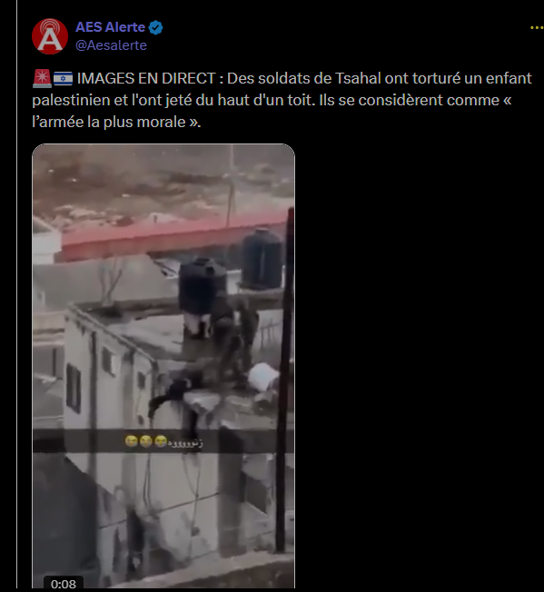 🚨🇮🇱 IMAGES EN DIRECT : Des soldats de Tsahal ont torturé un enfant palestinien et l'ont jeté du haut d'un toit. Ils se considèrent comme « l’armée la plus morale ».