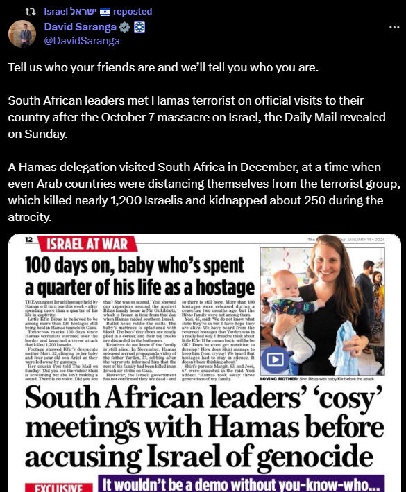 Une délégation du Hamas s'est rendue en Afrique du Sud en décembre, à un moment où même les pays arabes prenaient leurs distances avec le groupe terroriste, qui a tué près de 1 200 Israéliens et en a kidnappé environ 250 au cours de ces atrocités.