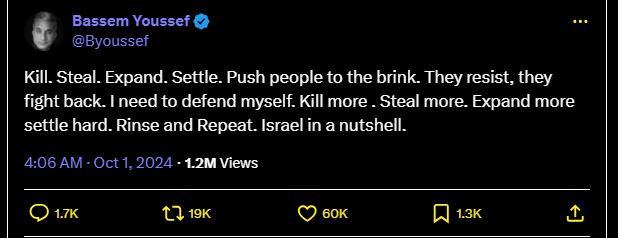 Tuer. Piller. S'étendre. Coloniser. Pousser les gens à bout. Ils résistent, ils se défendent. Je dois me protéger. Tuer davantage. Voler davantage. S'étendre davantage, coloniser fermement. Encore et encore. Voilà Israël résumé en quelques mots.