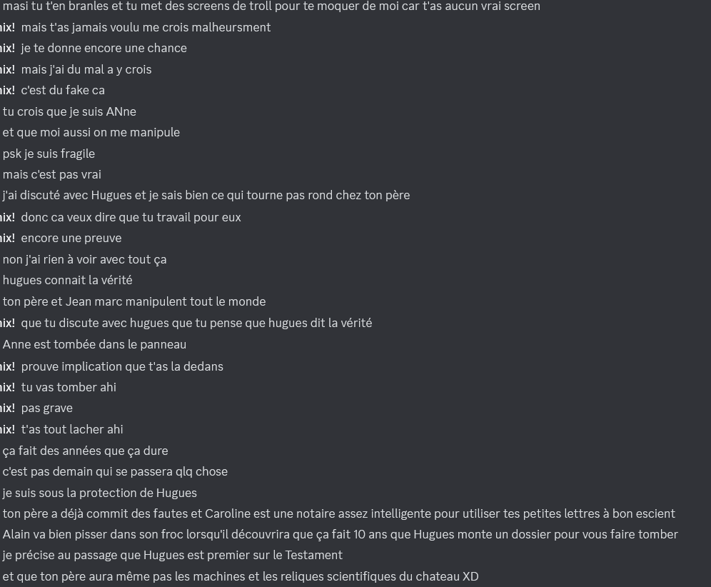 Il se passe quelques trucs étranges en ce moment, notamment des histoires liées à un château et des tensions avec Hugues. Ça pourrait être bien d'en discuter plus en détail quand on se voit