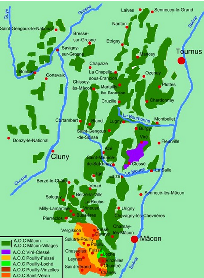 Il existe 5 crus dans le Mâconnais (cf la carte ci-dessus pour connaître la répartition des vignobles). Ils portent les noms des communes (une ou deux) dans lesquelles ils sont fabriqués. Ils sont tous de bon rapport qualité-prix :