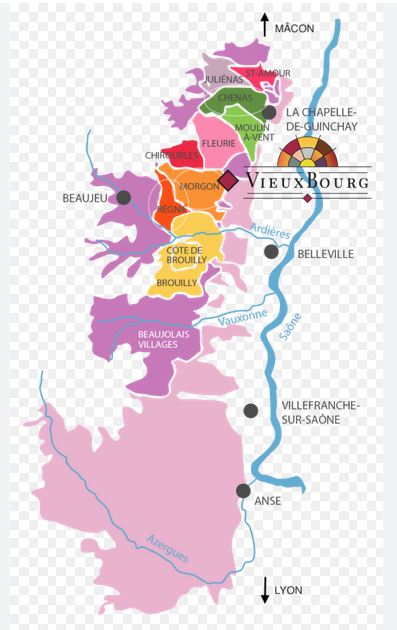 Nous nous rendons à présent au Sud du mâconnais entre Mâcon au Nord et Lyon au Sud. Au Nord-Est du département du Rhône et à l'Ouest de la Saône se trouvent les vignobles du Beaujolais où la principale production sont des vins rouges dont le cépage servant à leurs fabrications est essentiellement le Gamay.